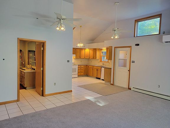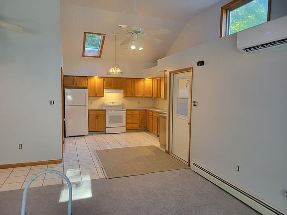 Repainted,new carpet ,and kitchen appliances. 1200 sq ft 2 bedroom apt on second floor over garage.one car garage included.on large rural property about 200 ft from landlords house. Water from well.septic system.oil heat and electric included in rent
