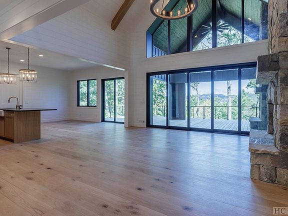 New construction just completed in the summit of Cedar Hill. Sweeping mountain and rock face views only a five minute drive from the Cashiers crossroads and resting at a cool 3900 ft elevation. An intriguing blend of contemporary design and rustic touches, this home exemplifies modern mountain style. A well thought out and executed floorplan allows all living spaces to be above grade and creates a light and bright feel throughout the home. The open layout gourmet kitchen features custom cabinetry by Garrett Taylor of Taylor'd Designs, quartz countertops, Jenn Air built in refrigerator and six burner gas cooktop range. An impressive stone fireplace graces the living room which seamlessly transitions to your outdoor entertaining area via a La Cantina multi slide glass wall. The outdoor entertaining space is generous and offers both covered and uncovered decking areas and a second stone fireplace. A well appointed primary suite complete with a private covered porch and a third stone fireplace along with a spa inspired bathroom reside on the main level, as well as a second guest suite. Two additional guest suites are situated on the upper level and offer family and friends large spaces and excellent views. Design touches throughout such as the iron and glass front door, custom designed floating stairway and steel cable railings provide a fresh approach to the mountain character of this home. Interior finishes include shiplap walls, tongue and groove wood ceilings, a distressed white oak floor and reclaimed wood features throughout. Entrance and egress of the property is gentle and easy utilizing a wide, boulder lined circle drive with ample parking for owners and guests and a detached two car garage. New construction, 5 minutes to town, gated, excellent view and high speed fiber optic internet, This home checks all the boxes! An excellent value in this market.