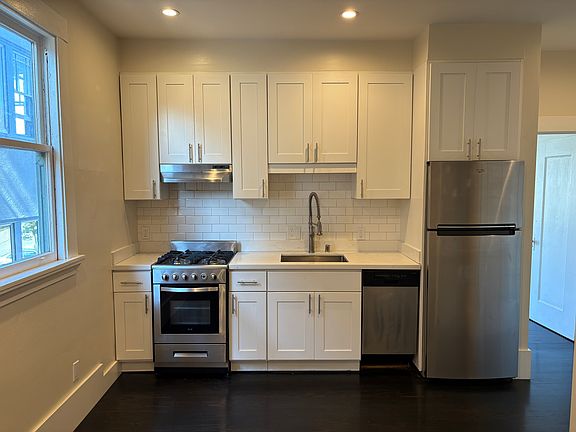 Renovated kitchen with quartz surface counters, gas stovetop and hood, shaker cabinets,and stainless steel appliances. The kitchen opens up a living area/dining area with electric/cable outlets ready for your flat mount TV.