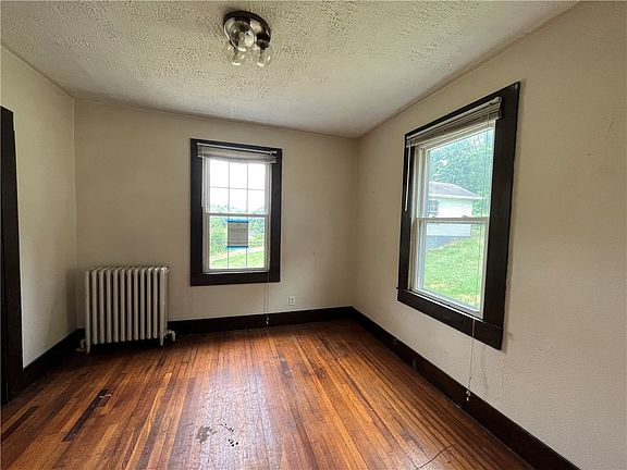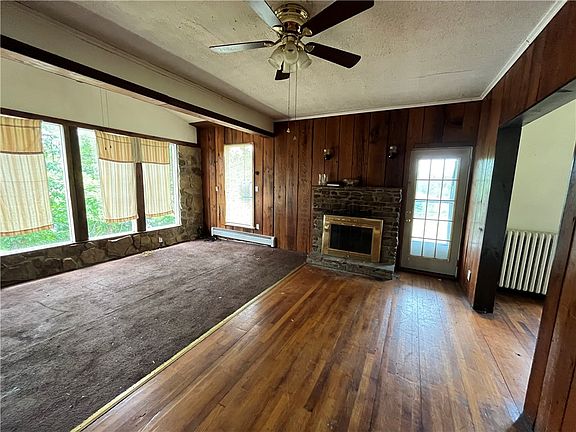 Close to 1/2 acre to call your own. Lots of windows in the large living room overlooking the countryside. Rustic interior to include wood plank and stone walls, as well as a wood burning fireplace. Hardwood flooring throughout. Large master bedroom, with updated bathroom that adjoins it. Upstairs could easily be converted to a 3 bedroom, due to the large room sizes. Detached 1 car garage, with extra storage for all of your toys, or a workshop area. Needs some TLC, but the possibilities are endless here.