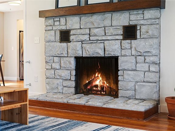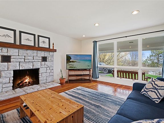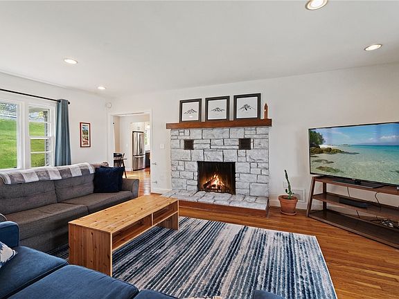 Step into the spacious living room, where a large bay window fills the space with natural light and frames the picturesque surroundings. Cozy up by the wood-burning fireplace or admire the gleaming hardwood floors and the warmth of radiant in-floor heating throughout.