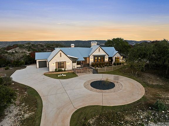 Designed in conjunction with French & French Interiors, out of Santa Fe New Mexico. Custom designed for the lot specifically to take in the front and rear hill country views. Dramatic Entry with Steel Glass Doors opens to the spacious family/dining areas with vaulted and beamed ceilings. Personality displayed by many different wallpapers seen throughout. Old Chicago brick, white oak wood floors (No Carpet). Kitchen Showcases black cement tile, custom cabinets, SKS appliance package, Mount Blanc Quartz counters. Custom designed cabinets showcasing a unique china cabinet and coffee bar. The hidden gem is the "dirty kitchen" next to the main kitchen that features a second sink, dishwasher, oven, and refrigerator that makes the perfect spot to prepare for the most intimate dinner party. Master suite with fireplace vaulted and beamed ceilings and private entrance out to the covered patio with outdoor kitchen and fireplace. Master bathroom features "his" and "her" sides connected by a pass through shower, separate toilets, and closets. Great flex space off the master bath that could be an exercise room, home office, hobby room... so many possibilities. Large guest suite with private entrance and patio to the front courtyard. Perfect spot for extended stay guests or a full time in law. Mud room has private entrance to the 2 car garage or the laundry room has a private entrance to the 3rd car garage. Secondary bedrooms are on the opposite side of the home featuring ensuite baths. The rear secondary bedroom has an entrance onto a private screen porch overlooking the large rear yard with hill country views. The Reserve at Falling Water is Comforts most exclusive gated community and has a community wide agricultural exemption to help save on those property taxes. Great location, less than 20 minutes to Fredericksburg or Kerrville. The Rim at La Cantera is just under 30 minutes. Come see all the charm Comfort has to offer named the Antique Capitol of Texas!
