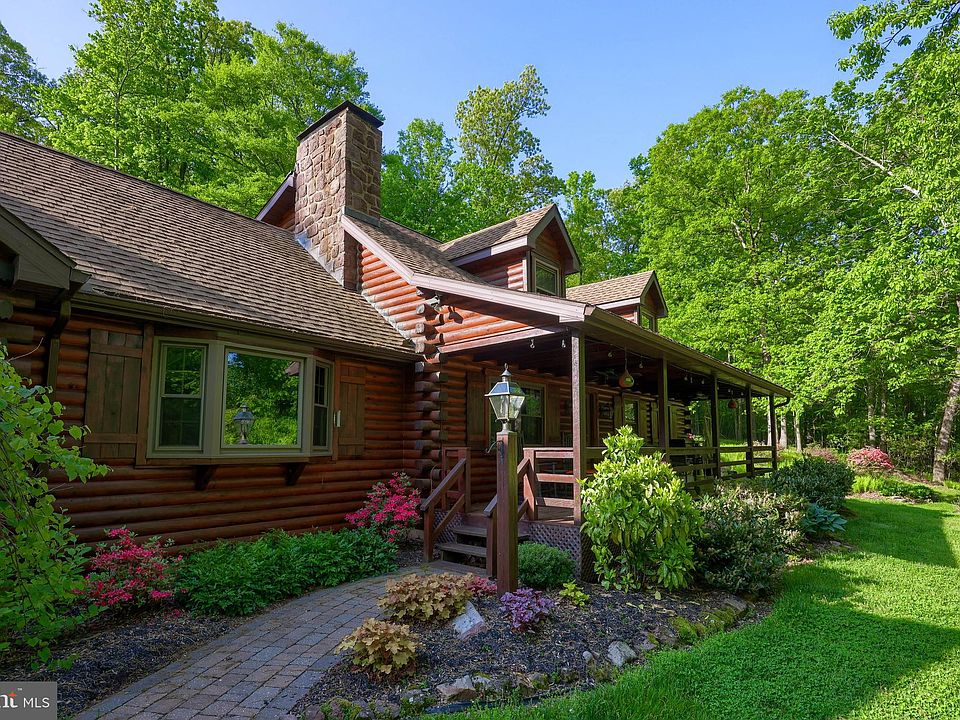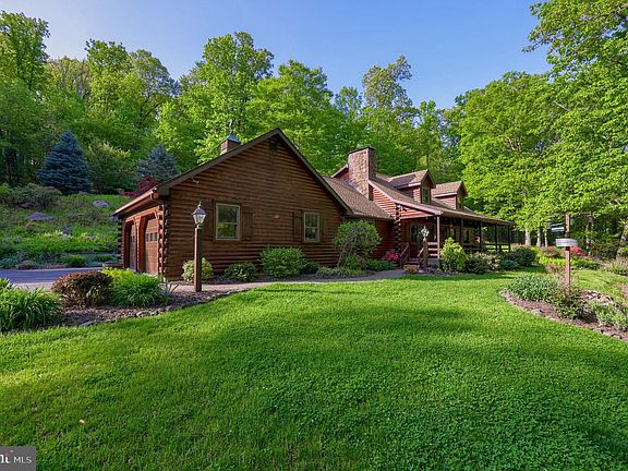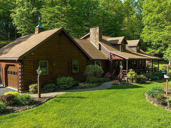 Beautiful, Secluded Custom Red Cedar & Pine Log Home with 2 car detached garage. Detached 3 car garage and heated shop on 13.66 acres. With approx. 2,900 sq. ft., this home is a masterpiece of pegged wooded floors, exposed beams, stone fireplaces, cathedral & vaulted ceilings, skylights and so much more! A wet bar in the fully finished basement to entertain. A beautiful covered porch and exterior bonfire area. This home has 3 heating options of wood burning, fuel burner, or electric heat pump with AC. Beautiful manicured flower beds and trees. This property is next to the famous French Creek State Park and The Historic Johanna Furnace. Bring your horses. Come see this magnificent property while it is available! This home comes fully furnished. All home furnishings and décor will stay!