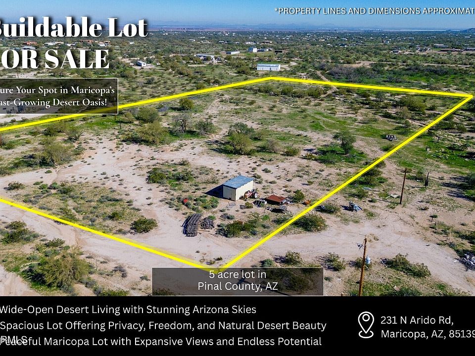 This 4.99-acre parcel is located at 231 N Arido Rd, Maricopa, Pinal County, Arizona, in a quiet rural setting surrounded by open desert and mountain views. The property offers dirt road access with power available along the road and extended into the property. An existing septic system is already in place, and water is available via water haul. Zoning allows residential use, including mobile and manufactured homes, providing flexibility for a variety of living options. No HOA, giving you the freedom to use and enjoy the land without additional restrictions or fees. The property also includes a small shed. SELLER FINANCING IS AVAILABLE, MAKING OWNERSHIP MORE ACCESSIBLE. An added bonus: the adjacent parcel is also available, allowing a buyer to combine both properties and own nearly 10 acres side by side ideal for added privacy, extended family, or investment.