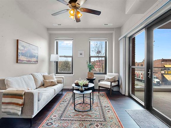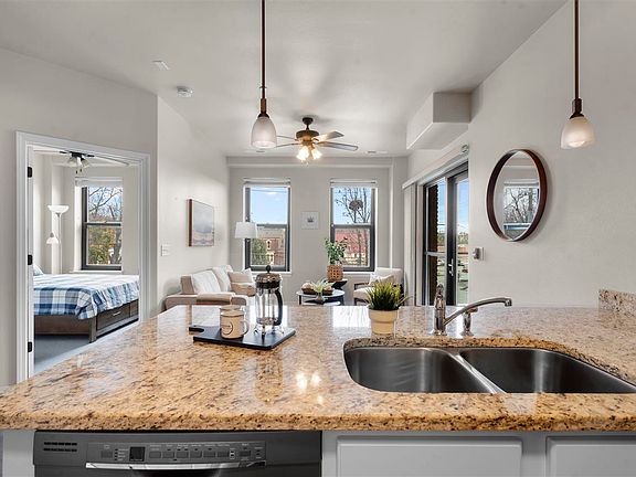 A rare opportunity describes this meticulously maintained and beautifully situated corner condominium located in the heart of Iowa City’s east side downtown district that represents the very best of what downtown living has to offer! Close to campus, coffee shops, restaurants, bars, book stores, parks, as well as modern urban and historical neighborhoods, this condominium is housed inside a secured building and offers an open floor plan with generously sized living spaces, including a kitchen with granite countertops, stainless steel appliances, a breakfast bar that offers seating for up to five, plenty of cabinetry for storage, and a full suite of included appliances. The adjacent living room can accommodate a large sectional or a traditional living set as well as a desk and offers so much natural light thanks to the large windows and the wall of glass in the living room that look out onto the private, covered balcony that has a mostly glass railing for unobstructed views of Linn Street and its beautifully painted streets, murals on exterior facades, established trees, and many tasteful music, cultural, and dining events that are hosted from Spring to Fall, such as the annual Farm to Table dinner. The bedroom currently accommodates a queen-sized bed, a large dresser, nightstand, and also has a large closet for even more storage. Ceiling fans in the main living space and in the bedroom along with the ability to open windows and the patio door on two sides of the home allow for great fresh air circulation. Thoughtful design has helped create storage spaces like the laundry, utility, and storage room where one can stow additional belongings out of sight. Other amenities offered are the building being secured, elevator access to all floors, underground parking garage with a dedicated space for this unit, an expansive rooftop patio that can be used to entertain that showcases panoramic views of downtown Iowa City and horizon line. Building is mostly owner occupied, but rentals are allowed. Come see the quality and beauty of this like-new condominium for yourself!