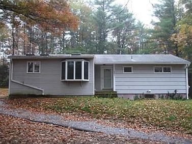 Great 2 Bedroom Ranch set on 1.89 acres! Pretty white cabinet kitchen with ceramic tile floor opens to dining room with wood floors and skylight.