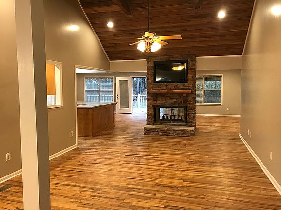 This lake view home is in EXCELLENT move in condition! New roof, new stainless steel appliances, new kitchen counters, new refinished hardwood floors in living, kitchen, and dining areas, new paint, new carpet in bedrooms, new tile in bathrooms. Located in a very desirable Baldwin County neighborhood with 3 Bedrooms, 2 Baths, split bedroom design, has open concept, Large great room with wood ceiling and stack stone fireplace open on both sides. Enjoy game day with room for many guests. The TV in fireplace stays! Master bath has dual sinks, a garden tub, a separate shower, and walk-in closet. Separate laundry room. 2 Car garage AND detached 2 car carport on almost 1 acre. View of the lake across the street. Nice sized backyard with large back deck perfect for outdoor enjoyment.
