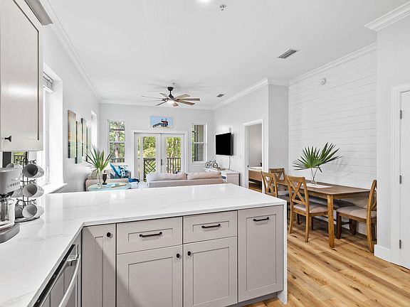 Offering a professionally curated design, this gorgeous three-bedroom end-unit in the heart of Seagrove Beach is the epitome of private coastal living. Upon initial approach, the welcoming entry way adorned with white oak styled LVP flooring leads way to the freshly remodeled kitchen and living area. The impressive kitchen features new cabinetry flanked with white quartz countertops with a waterfall edge, ample storage, new appliances, and an extended island perfect for entertaining. The seamless transition to the screened-in balcony is the perfect place to admire the new palate of mesmerizing hues emitted by the renowned Emerald Coast sunsets each night while simultaneously listening to the waves crashing onto shore in the distance. Synonymous with relaxation, the spacious main suite is a true oasis boasting a seating area and dual wardrobes. The sumptuous ensuite features dual vanities, and a walk-in shower with a separate soaking tub. A junior suite and bunk room with trundle share a full bath and are located just down the hall.