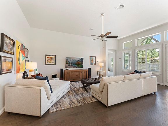 Stunning 1-story Gehan home in Grand Central Park offering 4/3/3 w/white 4-sided brick exterior, soaring ceilings & expansive windows filling the home w/natural light, complemented by plantation shutters & wood floors across main living. Open floorplan features a spacious family room flowing to dining & chef’s kitchen w/Nebula granite, oversized island w/seating, wine storage, SS appliances & gas range. French doors open to a versatile flex room - ideal as office, game or play room. Private primary suite boasts spa-like bath w/soaking tub, dual vanities, large walk-in shower w/dual heads & huge closet. 3 guest bedrooms are thoughtfully positioned up front away from primary for privacy. Generous utility room w/mud area & garage access. Enjoy a vaulted covered patio w/wood beam accents overlooking an expansive backyard - ready for you to make it your own. Grand Central Park surrounds you w/lakes, trails & resort-style amenities—don’t miss the chance to call it home!