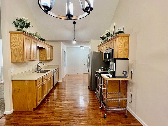 SOUTHSIDE - Super cute 3BD/2BA, with a split floor plan is situated on a flat yard with a sunny back deck! Spacious master bedroom offers a walk-in closet & large bathroom. Secondary bedrooms are also spacious & share secondary full bath. Hardwood flooring, new carpet in living room (2021) & new carpet in all bedrooms (April 2023). Galley style kitchen with ample cabinetry & eat-in dining. Laundry/mudroom area between garage & kitchen. Living room has vaulted ceiling & fireplace. Just off Hwy 77, great home... great location!