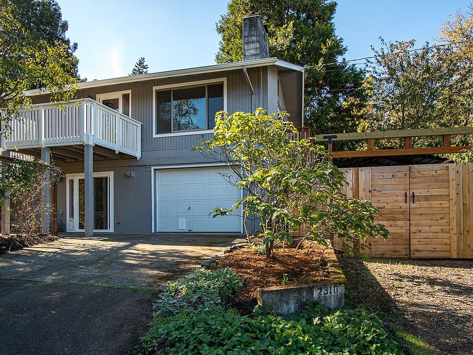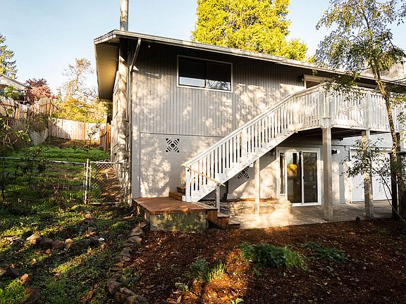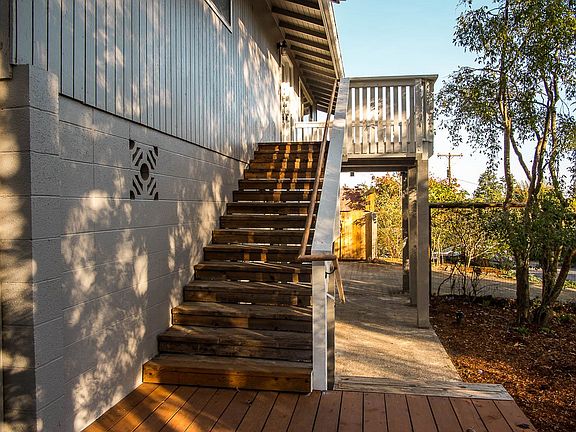 This recently remodeled house is situated at the end of a quiet, dead end street. Lots of windows & light. Updated kitchen & tiled bathrooms. Potential for at least 3 separate living areas! Almost 500 sq ft permitted & partially finished accessory building in the back yard has electricity, heat, insulation, drywall, vaulted ceilings, lots of light, deck, sunroom & built to code as livable space. 1 car attached garage plus 1 car carport. Fenced yard w/ mature plants & large terraced garden area.