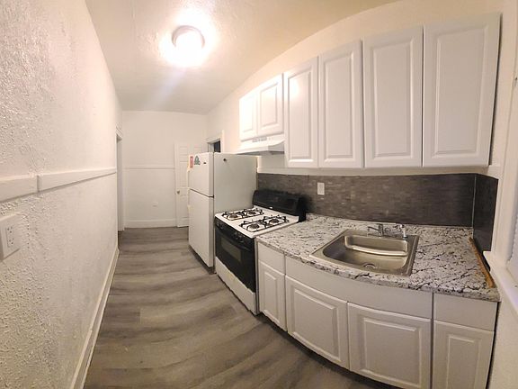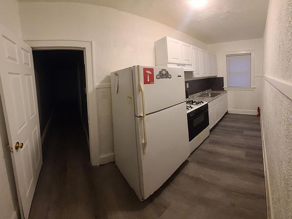 Freshly painted unit, window treatments, hardwood floors, newer kitchen and ceiling fans, refrigerator/stove, washer/dryer hookups, driveway/street parking. plenty of storage in basement. First floor unit on the right of this four family flat.