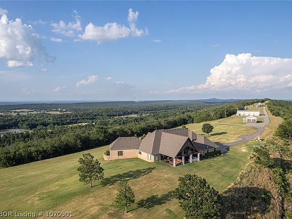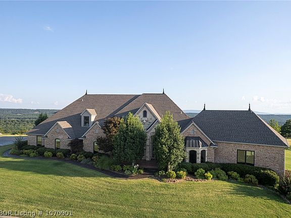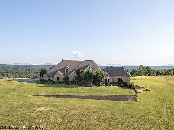 2310 Red Brown Place, Greenwood AR is now being offered with 77 +/- acres! New price! This elegant wilderness sanctuary is meticulously maintained, and provides a private-retreat atmosphere. You will understand how unique and special this property is as you travel the drive. Home offers 4816 SF/ 4 spacious bedrooms, 3 full baths, and 2 half baths. Don't miss the lodge-like bunks for the kids! The kitchen is a chef's delight: Large island with prep sink, French Door Refrigerator, Double Ovens w/ Convection. Warming drawer and instant hot water. The Primary Bedroom and Bath is spacious, flooded with beautiful light and patio exit. Custom features in the bath include a rain shower with jets and a hidden TV in the mirror. You will love the cutting-edge features, including geothermal heat/air and Marathon water heaters. New roof installed in 2020. Gorgeous natural light streams through the new windows added to specific areas in 2022. The main living area has been beautifully updated in 2020, new flooring throughout the entryway, living, dining room, hall, kitchen, and breakfast area. Experience the luxury of custom details, from barrel ceilings to extensive crown molding. The "Archers Delight" Room is warm with wood features, including custom cabinetry, hickory floors, surround sound, and a fireplace.