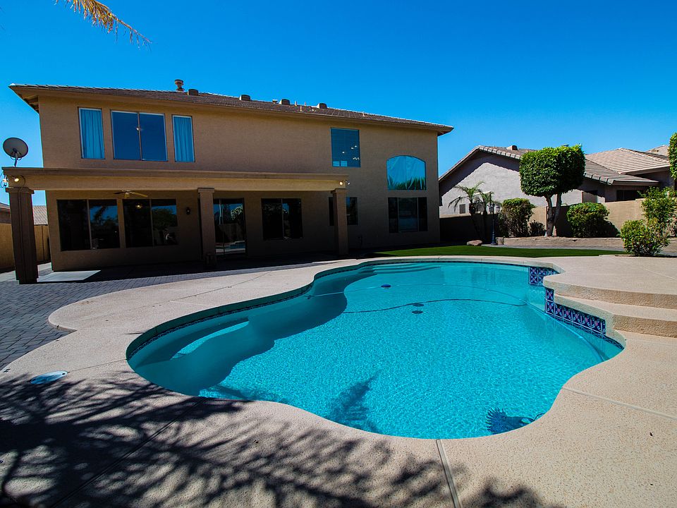 Beautiful home in Ray Ranch with 5 bedrooms, 3 bathrooms, 3 gar garage. This gorgeous turn-key home has it all with cathedral ceilings, bamboo and tile flooring throughout first level, separate living, dining and family room with gas fireplace, huge open kitchen with brand new range and large walk-in pantry. Second floor features a massive master suite, dual master walk-in closets, vanity and separate tub and shower. Large secondary rooms, full bathroom, custom iron work in loft and stairway, ceiling fans in all rooms and new carpet. Private backyard with a pool, pavers and synthetic grass. 3 car garage with epoxy flooring.