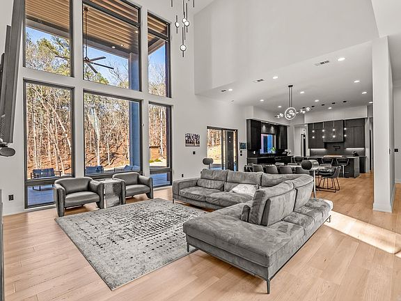 WLR modern masterpiece on wildlife blessed 7 acres just outside city limits - 5 mins from Chenal Promenade & Costco. This is an entertainer’s dream plan - perfect for the growing fam. Inside: immediately impressive 25’ ceilings, luxury vinyl, Venetian plaster fireplace with porcelain mantle, floor to ceiling energy efficient Anderson windows. Private veranda overlooks flat & level land w/ quiet creek. Immaculate kitchen: waterfall honed-granite breakfast island, farm sink, picture window to yard, walk-in pantry, +granite vent-hood +premium Monogram appliances integrated with the custom cabinetry. Breakfast’s 119” solid granite table can stay. Privately set apart on main level is Owner’s Suite w/ gorgeous honed granite, soaking tub, walk-in seated, 3-headed, rain & steam shower, +quartzite island +built-in vanity at walk-in closet. Also main level: private .5 bath w/ Versace wall paper +convenient laundry +in-law suite w/ walk-in shower & walk-in closet. Center-spine white oak stairs has play nook underneath & beautiful balcony landing to guest beds & guest bath.