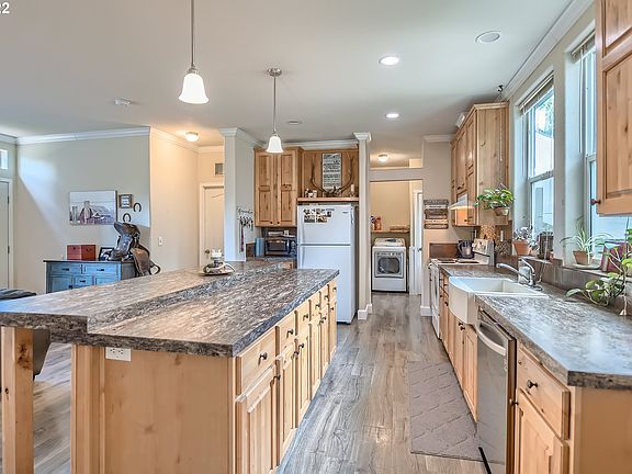 Open plan with crown molding and nine foot ceilings,knotty pine cabinets,large island,farm sink. Primary suite with walk in closet,double sinks,large walk in shower & linen closet.Two other bedrooms on opposite end of home each with walk in closets.Double car garage & carport,RV parking with hook up.Enjoy your private 12x16 heated getaway.Green house, raised garden beds, fenced yard & wooded view.