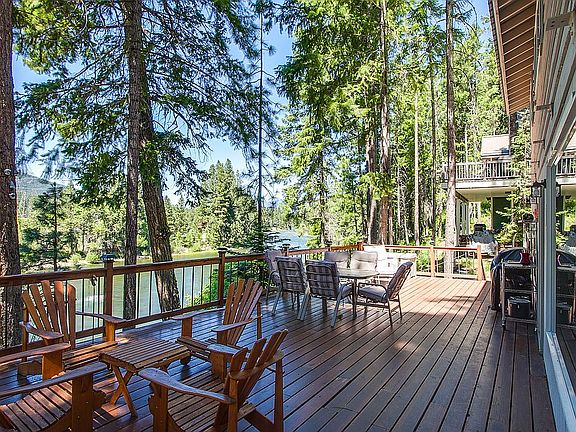 This Leavenworth riverfront home featuring a half-mile view up the Wenatchee River, has the perfect combination of timeless character and open functional space, while also providing you 65 feet of private riverfront ownership with stairs leading down to the water's edge. This fully-furnished cabin is the quintessential mountain retreat with a massive 16 x 30 ft deck perched above the running water. Large picturesque windows facing west cover the entire side of the home, including water views from three of the four bedrooms. Located in Ponderosa Estates, this community features a swimming pool, clubhouse, sports courts, kids play area, private hiking trails, and two community riverfront beaches that allow dogs.