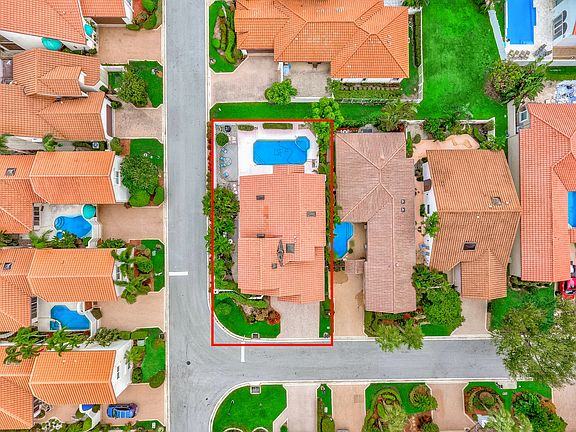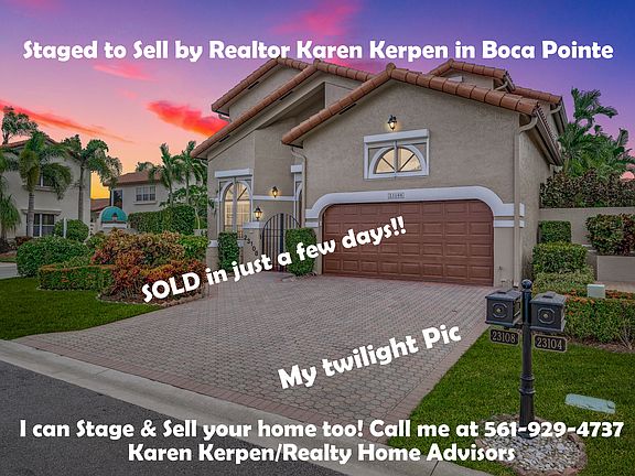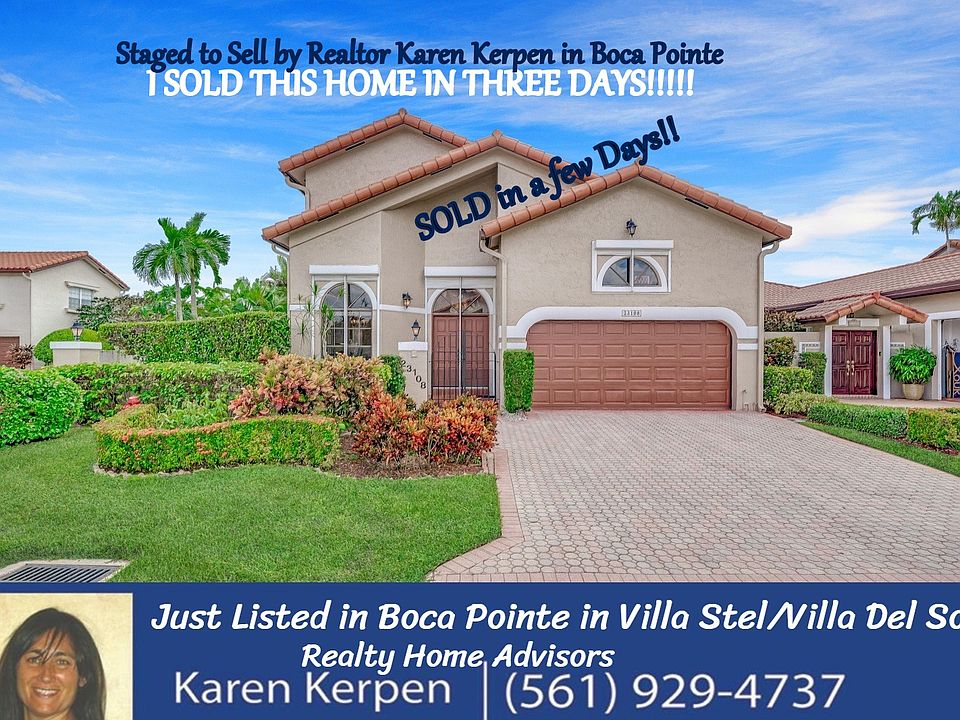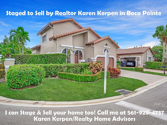Under contract in just a few days!!! STAGED AND SOLD BY REALTOR KAREN KERPEN. Mediterranean inspired community of Villa Del Sol/Villa Stel in Boca Pointe has a custom designed 3 bedrooms, 3 full baths, 2 car garage, Salt Water/Heated Pool Home on the largest corner lot in the community. Dramatic entrance w/soaring 2 story vaulted ceilings. Enjoy the sense of openness, volume, & space with this light and bright home with its open floor plan. Enter into foyer which leads to dining room and living room with plenty of windows, sliders and sky lights! All carpet has been removed and there is a large beautiful tile flooring downstairs and a wood look tile on the staircase and upstairs. Kitchen big center Island with new KitchenAid Cooktop, Bosch Microwave/Convection Oven, Bosch Wall Oven, has tile backsplash, tons of cabinetry, a large pantry, recessed lighting, tile flooring, a sunny eat in area Plus a door to go outside to a side patio which makes extra eating and entertaining space! The downstairs bedroom is very spacious and could easily be called the downstairs master bedroom. The downstairs bedroom is enormous, and the bathroom is huge as well, it would just need to be slightly reconfigured so you would have bathroom access from the bedroom which are just next door to each other. Even the huge walk in closet is bigger than most master bedrooms. Upstairs features 2 master suites and one has its own private Romeo & Juliet balcony, plus 2 super gigantic large walk in closets and a linen closet. Both of the upstairs Master suite’s have skylights and the larger master suite has dual sinks, a bidet, a huge soaking tub & a separate shower. Other master suite has another huge walk in closet and private bathroom. The pool and patio area are oversized and very private. The pool is heated and has a raised deck & spa that has a waterfall into the pool plus 3 fountains/water features in pool plus an Inlay of bull. Outdoor shower with hot water as well as cold. Newer electric pool heater and salt water pool. Composite decking for additional patio space in back yard and side yard. Large corner lot has tons of landscaping and is private and big all around (back and side). The patio has an electric awning to add extra shade. The backyard is the perfect place to relax with a book or for large fun parties! S-tile Roof from 2005 is in great shape and the home features electric hurricane shutters on windows and sliders. Other features of this home include: custom stain glass window over front door & stained glass round window, New (Dec 2018) 5 Ton Trane A/C, Laundry inside/closet with LG washer – Smart Drum/LG Dryer – Hydroshield. Large storage area under the stairs and NO popcorn ceilings here/just a smooth finish. The garage has a large storage closet plus additional storage located across top section of the 2 story high garage & has space for 2 cars and so much more! Via Stel (within Boca Pointe) is an intimate circle of 90 homes and has an amazing community pool area. You have your own private pool but you have the community pool as well! The low monthly maintenance fee of approximately $367 a month includes lawn care, alarm system monitoring, and cable including HBO. Boca Pointe is a man gated community. Boca Pointe Club Membership is OPTIONAL not mandatory. OPTIONAL golf/tennis/gym & social memberships available. All ages ok! Pet friendly community. Amazing schools.