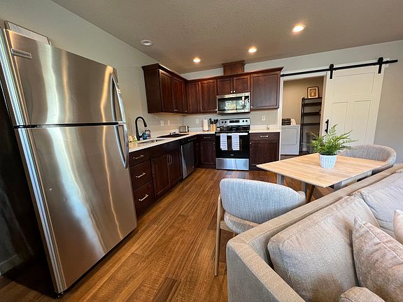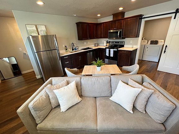 Beautiful home above garage with 2 bedrooms (1 bed 1 Office/Den), 1 bathroom in a quiet homeduplex built in 2021. Home features one, large private car garage and off street parking, and independent utilities included. A second unit has its own entrance/garage unit attached, but the home is separate with its with its own entrance.
