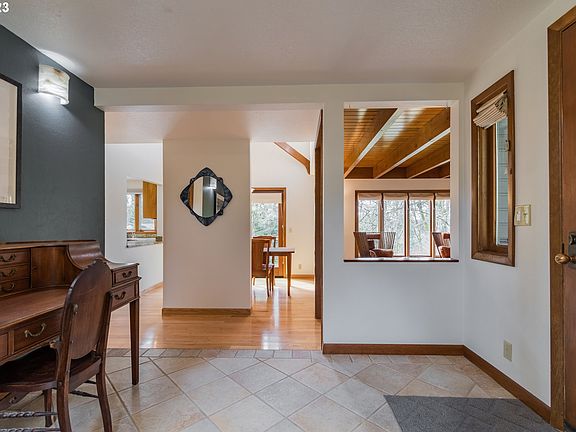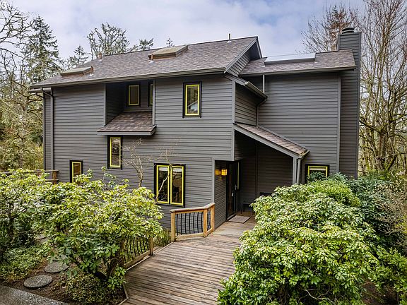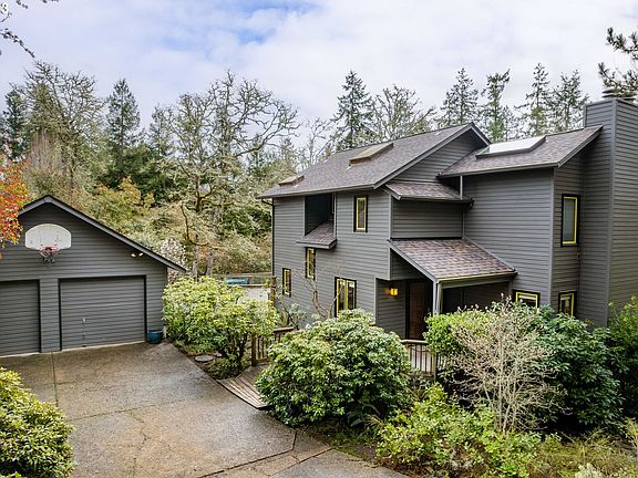 Stylishly Custom NW Contemporary in Ultra-Private SW Hills Cul-De-Sac on .41 Acre Lot! Well-designed floor plan with wood accents, cool architectural details, hardwood floors, high ceilings and skylights. The living and dining areas exude warmth and the numerous windows allow you to appreciate the tranquil setting. The updated kitchen with stainless appliances opens to a sunny family room. Vaulted primary ensuite features a fireplace & all 3 bathrooms have been remodeled. French doors lead to wrap around deck, abundant outdoor areas & entertaining spaces, fenced backyard and garden area, beautifully landscaped front yard, sweet courtyard, and fruit trees. Brand new roof, heat pump offering central heat & air, oversized detached garage and plenty of parking!