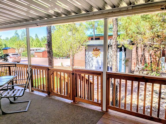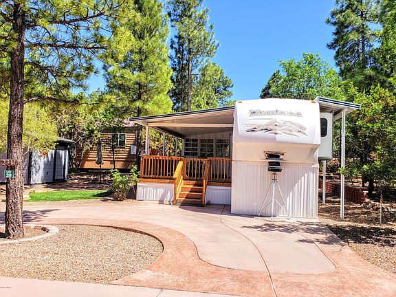 Come escape the heat in this set up ready to go RV with a nice sized deck to enjoy the mountain air. Very well cared for and has the original awning under the unit. Comes witha extra fride under the front and has plenty of storage. Nice brick patio and shed with electric. Closet has hookups for a space saver stackable washer/dryer. Hoa includes water,sewer, community trash, and common area.