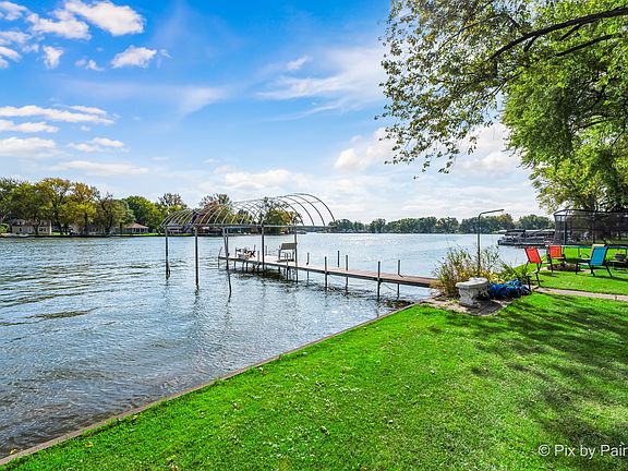 AMAZING VIEWS FROM THIS 3 BEDS / 2 BATHS HOUSE ON OVER 60 FRONT FOOTAGE ON THE FOX RIVER LOCATED ON A CURVE TO DUTCH CREEK BAY & THE CHAIN O'LAKES! This Open Concept House has it all w/ Oversized Living Room w/ Wood Beams and Woodburning Fireplace w/Stone Accent, Large Dining Room, Gourmet Kitchen w/ Stainless Steel Appliances & White Cabinets and Granite Countertops, First Floor Full Bathroom, Private Primary Bedroom, Two Additional Generous Sized Bedrooms on the Second Floor, Second Floor Full Bathroom, First Floor Utility Room, Converted Outbuilding and Perfect for a Private Office or Family Room or Private Retreat, Shed, Professional Landscaping, Multiple Decks Facing the River, Property is on City Sewer, Pier & Steel Sea Wall, and Much More!