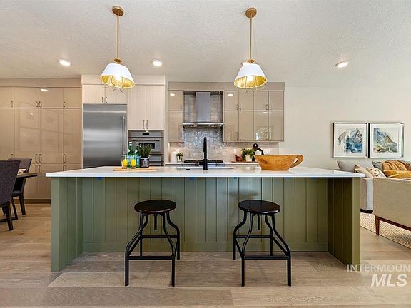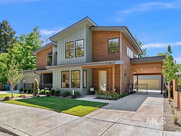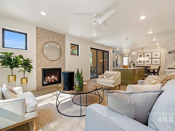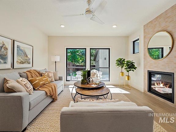 Perfectly situated in the North End, this WR Gann home tells a story how true luxury isn’t defined in square footage. With modern flair & stylish finishes this townhome lives as a single family residence. The main level boasts a gourmet kitchen w/ Thermador appliances w/ a built in fridge, stunning custom cabinetry, quartz countertops w/ large island bar & dog/cat cove! The layout maximizes every square inch and is well-lit thanks to the floor to ceiling black frame Anderson windows. A gas fireplace is flanked w/,0 brick, plus cable ready connections. Enjoy the primary suite equipped with treehouse vibes, spa like bathroom finishes & walk in closet. The third bedroom or the upstairs flex space could be an ideal Zoom Room. The cedar lined portico adds a stunning design element to access the low maintenance backyard. This location is close to it all, nestled between Sunset & Esther Simplot Parks and quick access Ridges to River trails & downtown.