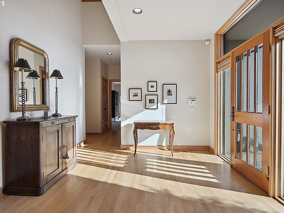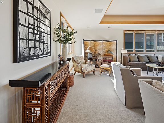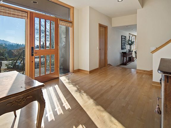 Nestled in Portland's West Hills, this custom-built contemporary home uses thoughtful design to maximize natural light and stunning views. Tall ceilings and rows of picture windows flood the interior with sunlight throughout the day, highlighting clean lines, warm wood trim, and elegant built-in details. Distinctive architectural elements, like a curved staircase and illuminated floating tray ceilings, emphasize the home’s unique craftsmanship. A functional layout seamlessly connects multiple gathering spaces - a living room with a floor-to-ceiling stone fireplace and a dining room with handmade built-ins both open onto a spacious deck, creating an effortless indoor-outdoor flow perfect for entertaining. The kitchen pairs extensive counter space and high-end appliances, including dual wall ovens and a Sub Zero refrigerator/freezer, with a sun-drenched breakfast nook that opens to a side yard. Completing the main level are a full bath and a versatile den with outdoor access that could serve as a 4th bedroom. Upstairs, the primary suite captures both northern and southern light through two walls of windows, and features dual closets and a luxurious bath with soaking tub and shower. A generous laundry/mud room on the lower level offers abundant storage. Meticulously maintained by the original owner, the property is in pristine condition with a low-maintenance yard and backs directly to protected green space. Bordered by 5,200-acre Forest Park and its 80 miles of trails, the Northwest Heights neighborhood offers the ideal blend of seclusion and convenience, just 20 minutes from downtown Portland.