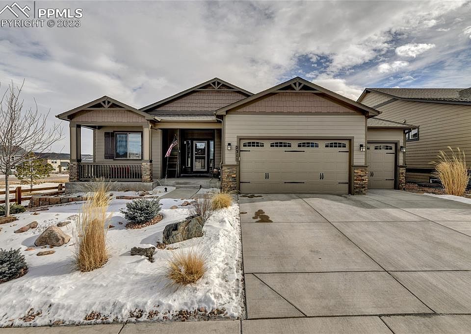 Welcome to this beautiful home in the picturesque Forest Lakes master-planned luxury residential community! Semi-custom built in 2017 with thoughtful inclusions, this home is move-in ready. Enjoy main-level living with gorgeous ranch and mountain views, relax in front of the gas fireplace with built-in blower in the winter, or out on the covered upper or lower patios in the summer with custom-added privacy features. The main level primary bedroom has mountain views and ample natural light, complete with its own ensuite 3/4 bathroom with quartz countertop, double vanity, separate water closet, walk-in shower, and walk-in closet. A hot water recirculation system keeps hot water readily available anywhere in the house. The open concept and spacious kitchen on the main level make entertaining a breeze with island bar seating around a beautiful granite countertop, a walk-in pantry, and plenty of outlets! Need more space for entertaining? The basement level has plenty of open space as well, complete with a wet bar and walk-out patio. The fully-insulated and optionally-heated 3-car garage is finished with stunning polyaspartic epoxy floor coating, and 2 bays were built with 4' of extended space so there's extra room for storage, tools, and more, and the 8-foot doors allow for larger/lifted-vehicle access. The outdoor shed compliments the house and is perfect for storing plants, patio cushions, and more for all seasons.