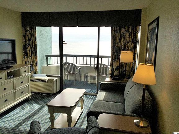 Perfect beach get-away and/or investment! Beautiful 1BR-1BA ocean front condo at Compass Cove in the Pinnacle Tower. Fully furnished with kitchen, 2 double beds, a pull down Murphy bed in the living room, and sofa bed for extra guests. Located on the South end of Myrtle Beach , the Compass Cove has amenities galore: 6 indoor/outdoor pools, lazy rivers, hot tubs, a fitness room and game room. Crows Nest Restaurant and a poolside Tiki Hut Bar and Grill. Located minutes away from the Myrtle Beach Airport, Broadway at the Beach, Sky Wheel, Tanger Outlets, multitude of restaurants and golf courses. NO owner financing.