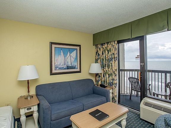 Spectacular ocean views from the ninth floor! Beautiful 1BR-1BA ocean front king suite at Compass Cove in the Pinnacle Tower. Fully furnished with kitchen, a pull down Murphy bed in the living room, and sofa bed for extra guests. Located on the South end of Myrtle Beach , the Compass Cove has amenities galore: 6 indoor/outdoor pools, lazy rivers, hot tubs, a fitness room and game room. Crows Nest Restaurant and a poolside Tiki Hut Bar and Grill. Located minutes away from the Myrtle Beach Airport, Broadway at the Beach, Sky Wheel, Tanger Outlets, multitude of restaurants and golf courses.  NO owner financing.
