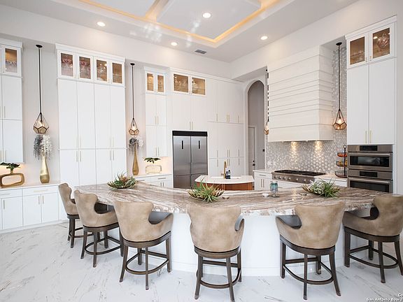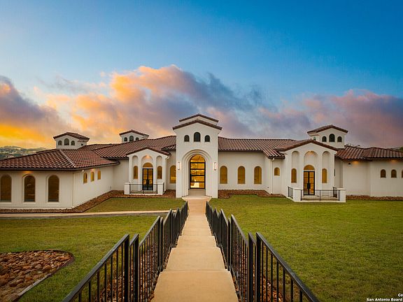 Welcome to 23114 Stallion Ridge in the highly coveted Canyons At Scenic Loop. Built on a 1.35 acre greenbelt lot (2 Lots) with remarkable VIEWS, this Modern Spanish Revival is "One of a Kind" with its unique and intricate custom designs! As you enter the 10ft pivot Iron door of this 4702sqft single story, you will be greeted by sophisticated architectural niches and an open floor plan with 13' to 23' ceilings throughout. In addition, each room in the house has its own unique ceiling design - Just Amazing! A gourmet kitchen awaits your presence! A Thermador 48-inch gas cooktop, double ovens, a hidden pantry, 13ft tall frameless Euro-Style cabinets, a 16ft double stacked curved island, and a 48-inch built-in commercial grade refrigerator. The openness between the kitchen and living is perfect for entertaining and is augmented by the wall of windows that captures the beautiful Hill Country Views! In this tech savvy house each window covering is remote controlled and there are surround sound speakers in the living, primary, kitchen, sauna, back patio, and outdoor kitchen. Make your way to the MASSIVE 26 x 19 primary suite with a Luxury Spa bathroom! Here you will find an eight person sauna, coffee bar, floating vanities with accent lighting, a 14 X 14 and 14 X 16 his & her closets, a remote controlled shower and a private patio area. Please note that every door leading to the outside is a CUSTOM IRON DOOR that is at least 8 ft tall (8 total Iron doors). The icing on the cake is the patio's expansive outdoor living area in addition to the 700sqft detached gazebo with a full outdoor kitchen that has Coyote appliances. This piece of paradise is the ultimate definition of a Custom Home and it won't last long! All furniture is available for sale!