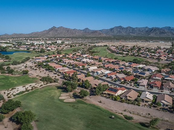Want to live right on the golf course, and also enjoy STUNNING views of the White Tank Mountains? Welcome to paradise, in the Sundance Active Adult Community! The eat-in kitchen has plenty of storage in all of the right places, with an additional kitchen island, and walk-in pantry. The open and airy primary bedroom features vaulted ceilings, and en-suite bathroom with walk-in shower. An additional bedroom features is own full bathroom just opposite of the primary, and is separated by a third bedroom with double doors - perfect for an additional guest bedroom, or office. Vaulted ceilings in main living room, plantation shutters throughout, security doors on front/back doors, and a newly updated, disinfecting A/C system are some other notable features. Your always shaded, north-facing covered patio offers incredible golf course and mountain views all year long!