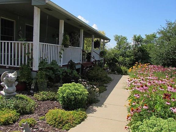 Spacious one level living! Country comfort & charm are yours with this rural ranch-style home. This property offers an incredible backyard view, a beautiful farmers front porch overlooking an expansive front yard surrounded by trees, flowers & perennials. A concrete basketball court next to your above ground pool w/deck, and an amazing landscaped patio makes entertaining a joy. A garden to satisfy your green thumb. Large det garage w/ horse stalls. Chicken coop & greenhouse. A beautiful home!