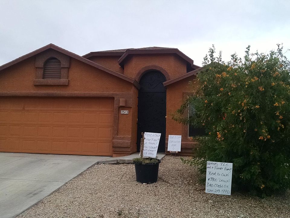 Rent 2 Own Your Forever Home!!! Minor fixer! No Banks!!! E-Z Qual!!! Tres Pueblos neighborhood home, 4 bedroom 2 ba 1760 sft, built in 2006. Open kitchen with corian counter tops and an island for convenient cooking space, eat-in kitchen and good sized pantry. Dark wood cabinets and black appliances. Vaulted ceilings. Large living room and family rooms have wood laminate floors. Master bedroom has double entry doors. Master bathroom is large with a garden tub, a separate walk in shower and private toilet space. 2 car garage. Backyard has a producing citrus tree, covered patio and plenty of room for the kiddos and dogs to play. Close to elementary and high school. Walmart is just up the road. Cross streets are Drexel and Tucson Blvd. Minor fixer - could use a bit of TLC and maybe a fresh coat of interior paint. You get to choose your colors! $3,900 down plus the first month ($1,695). $5,595 total moves you in. We offer an alternative to banks for people who are ready to be home owners, can afford the monthly payment, have the $3,900 down payment and are ready to own. We qualify by income not credit score. We appreciate the local small business owners! Please take a drive by and have a look around, check out the neighborhood, talk with the neighbors, etc. If it's a good fit for you please take an application from the home. Complete and return to the email address on page 3. After the review process we will contact you to schedule a showing. We do not charge any fees. For more information call 520-219-4442 (landline)