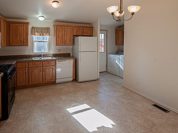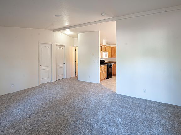 Newer manufactured home with a split floor plan and vaulted ceilings. The home features a walk-in closet in the master suite, updated appliances in the kitchen, ceiling fan ready, new carpet, and freshly painted. Roomy front yard gives you a little privacy and there's also a dog run out back for Fido.