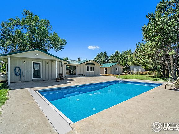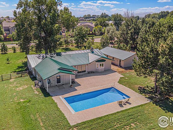 Amazing opportunity! Close-in 4-bedroom 3 bath, 3053 square ft. ranch style home on 6.7 Irrigated acres in SE Fort Collins zoned urban estate! All on one level, this home features an open floor plan, extensive hickory floors and generous room sizes. Open Kitchen to living room and dining area. The expansive primary bedroom features 4-piece bath with slipper tub and walk in shower, walk-in closet and access to the patio and pool area. In ground heated saltwater pool. 1/7 of a share of Blehm irrigation water included. Oversize 3 car garage/shop, barn with 4 box stalls, wash rack, tack storage and feed room, arena, 2 loafing sheds, 3-sided hay storage/ tractor storage shed. Close to wonderful schools, shopping, grocery, restaurants, employment centers, medical services, and I-25.