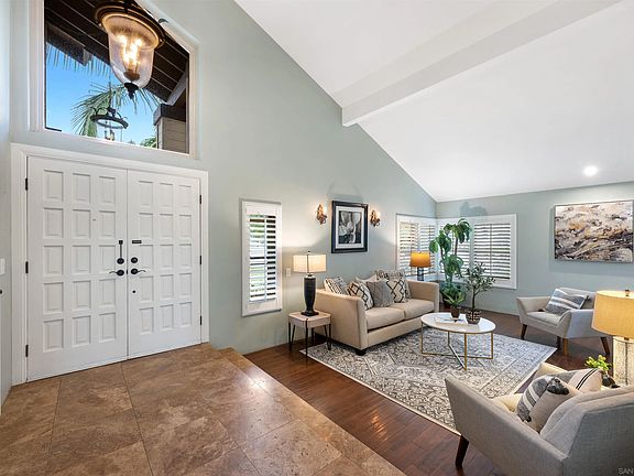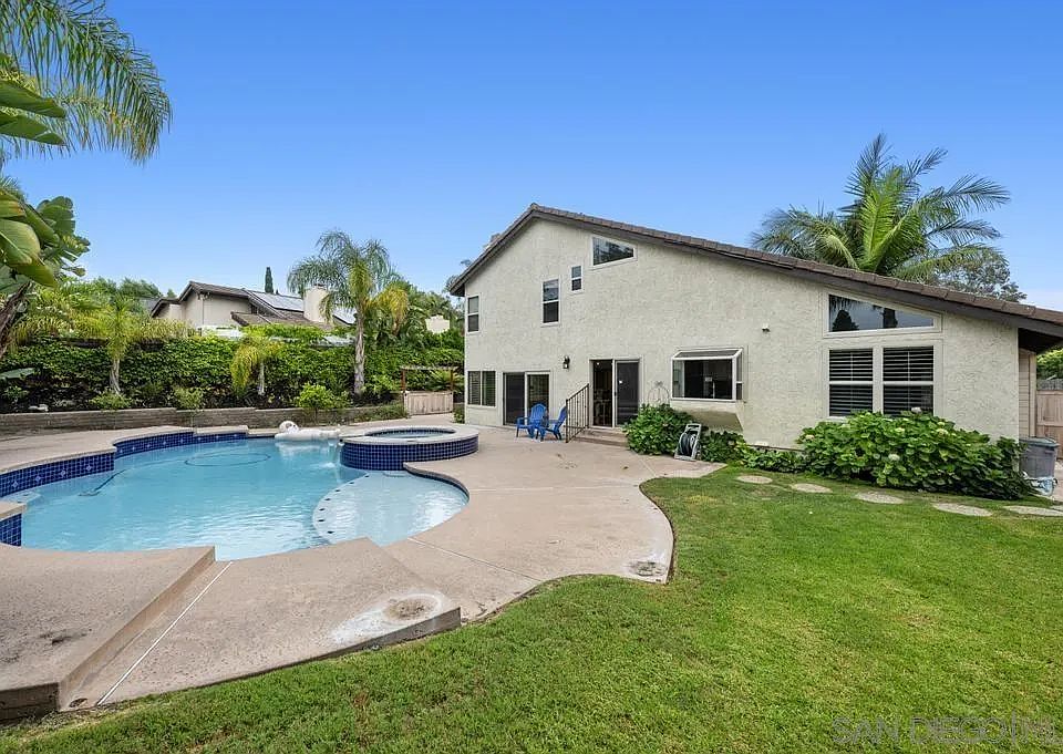 South Carlsbad CUSTOM home on a unique street of other gorgeous customs with mixed architectures. Large, private, elevated corner lot with solar heated pool, spa, and grassy area ideal for kids & pets to play. Back yard entertainer's delight: Updated pool & spa with Baja ledge & quartz plaster. Very private location. Four bedrooms, three baths, with one BR & BA down. Travertine & hardwood floors. High ceilings. Double pane windows w/shutters. Crisp white kitchen with granite countertops and SS appliances. Recessed lighting. Solid wood interior doors. Fireplaces in family room & primary bedroom. Downstairs bedroom is ideal for guests, office, game room or kids play area. Encinitas Schools. No HOA.