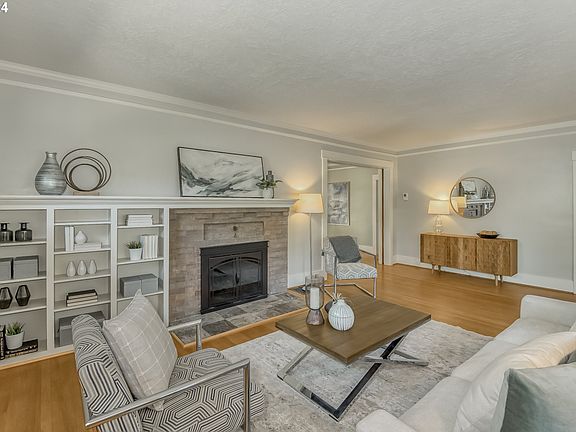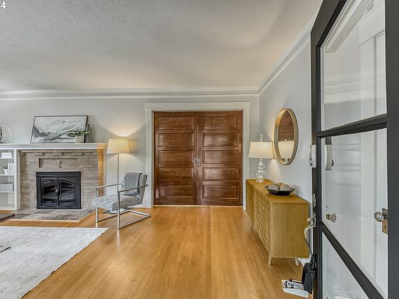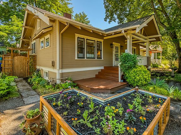 Sit awhile on the covered front porch of this Rose City Bungalow and watch your flowers grow. This neighborhood has many mature shade trees, and this cutie sits high off the street. Walk inside and find oak floors, double-hung and lead-lattice windows with custom wood storms, a built-in bookcase, classic trim, picture rails, and a wood-burning fireplace. Original pocket doors create a formal dining room with vintage built-ins, display cabinetry, glass-paneled wood windows, and a back door that opens to the expansive "forever" wood deck. The kitchen is the perfect size and keeps the vintage vibe with classic wood cabinetry and trim. The gas stove, dishwasher, and French door refrigerator are all stainless steel. This space backs to an original mud room with shelving, an additional back door, and stairs to the basement. Two bedrooms (one with an office or reading area) and a sleek, re-designed bathroom finish this main level. The basement is 815 SF of opportunity with high ceilings, a workbench, a craft sink, storage, and room to expand your living space. You will access the tuck-under garage from this level. Also, find an additional refrigerator and washer/dryer set in this home. Your view from the dining room is expanded east to a spacious, private, "fairy garden" backyard, fully fenced and bordered by deep flower beds. This delightful garden houses a specimen Locust tree, creating dappled sunlight on the lawn and allowing afternoon rays on the u-shaped galvanized steel raised bed. These raised beds are also ideally placed in the front of the house so you can change your garden pallet with every season. The Walk Score is 89, and the "Biker's Paradise" Score is 93. Steps away from the Hollywood Theater, hip bars and restaurants, a weekly Farmer's Market, shops on Fremont, and gourmet grocery stores. Just Minutes to Downtown, PDX, or golf course. Rose City Park could be Mr. Roger's Neighborhood! Make this delightful property your new home! [Home Energy Score = 5. HES Report at https://rpt.greenbuildingregistry.com/hes/OR10231219]