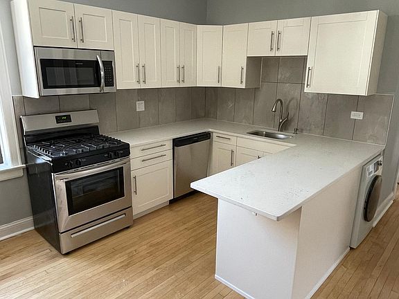 Brand new 2 bed 1 bath UK Village apartment. East windows pour sunlight into this newly remodeled home. Fresh hardwood floors and new paint throughout. Bathroom features new vanity and tile work in shower. Kitchen has all new appliances, quartz counters, tile backsplash, new cabinets, and chrome sink and hardware. In unit washer dryer. Central heat and a/c. Dedicated storage locker in basement and additional storage on the back porch. Tenant pays for gas and electric.