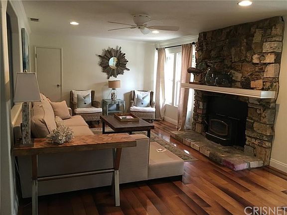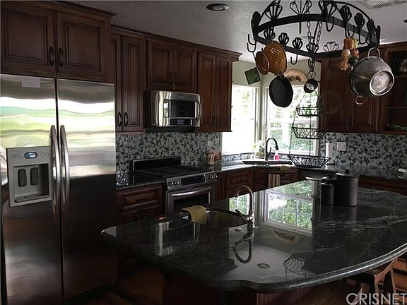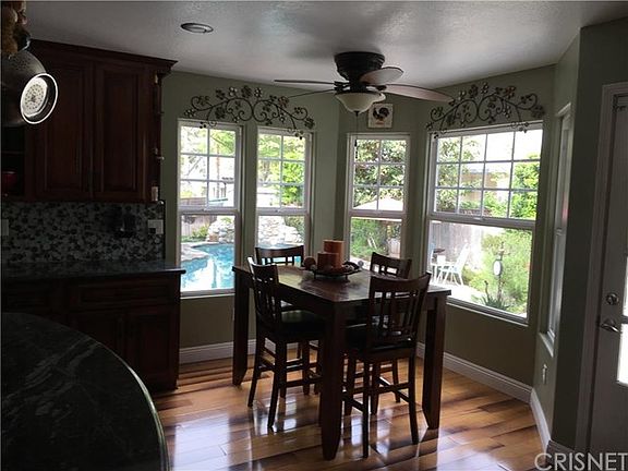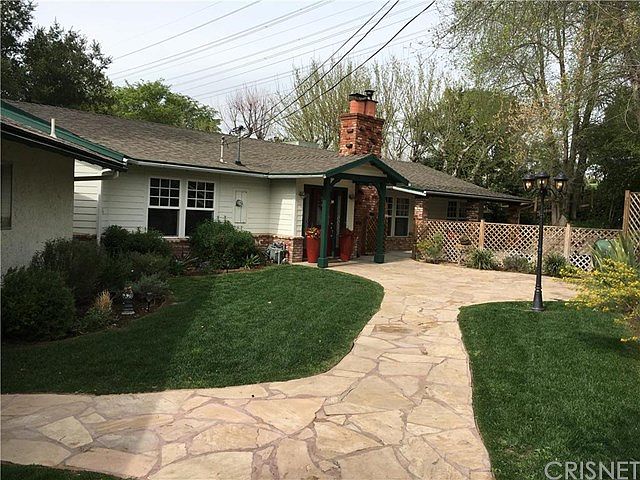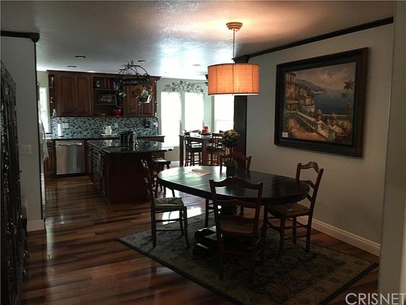 Beautiful custom ranch style home in Happy Valley area of Newhall. This home features hardwood floors throughout common areas of the house and studio apartment. Entertainers kitchen with granite counters, island with prep sink, glass tile backslash and custom cabinets. Kitchen has breakfast nook over looking the backyard pool. Living room has a custom rock fireplace and dual pane windows throughout. Large laundry room with sink & Whirlpool washer/dryer that stays. The master bedroom has vaulted ceilings and French door leading private spa. There is a triple mirrored door closet & walk in closet in master bathroom. Ceiling fans in the living room, kitchen nook, Master bedroom, large bedroom, office and studio. The master bathroom has heated tile floors, jetted soaking tub and walk in double shower. The front yard has a covered porch, stone walk and patio with separate gated play area. Driveway is large enough for RV parking. Studio apartment is 320 Sq Ft. attached to the garage, has hardwood floors and includes its own washer/dryer, water heater, wall heater 3/4 bath, kitchenette with fridge sink and stove.