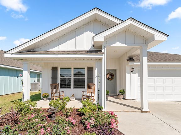This BETTER THAN NEW Cali floor plan is 1 year old and features Hardie Board exterior, an open kitchen with an island and a split bedroom plan. The kitchen features a new tile backsplash, new cabinet hardware, stainless steel appliances, which includes an upgraded oven, as well as granite countertops. Primary bedroom includes large en suite bathroom and walk in closet. There is no carpet throughout the home, and ceiling fans have been added in every room as well as on the patio, and blinds throughout the home are included. This home boasts both a front and back covered porch and is GOLD FORTIFIED. It sits on a premium lot that backs up to water and the sellers have added a sprinkler system in the front flower bed. The home has energy efficient features which include thermal doors, energy star rated double pane windows and a 14 SEER Carrier heat pump. The location in Oldfield is perfect- just minutes from shopping, restaurants and i-10. Schedule your showing today, this one won't last long!