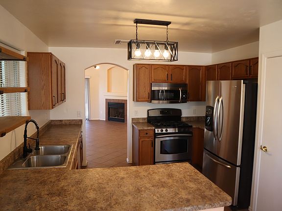 This marvelous 3 bedroom 2 bathroom home with almost 1350 square feet has an attached THREE car garage and will be one you want to see Culinary kitchen is open with a built in microwave, breakfast nook, a pantry closet, garbage disposal, refrigerator, and lots of cabinet and counterspace. More fantastic features of this home include central A/C, nest thermostat, water softener, shower/tub combo in both bathrooms, ADT alarm system installed but will be on the tenant to pay/activate, walk in closet in primary bedroom, fireplace, and much more! Backyard is low maintenance with all gravel, covered patio, block wall fencing, and beautiful views of the mountains.!!