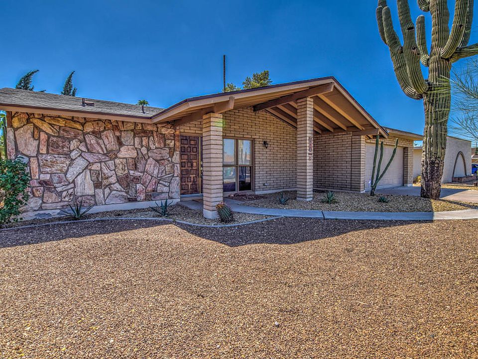 Welcome home! Three bedroom, two bath home on large homesite with NO HOA! Formal living room, large family room/dining area, updated kitchen, Arizona room and more! Master suite features en-suite bath with double sinks and walk in shower. Guest bedrooms and bath are split from the master. Backyard features a pool and artificial turf. Two car garage. Laundry room with tons of storage. Low SRP bills with OWNED SOLAR SYSTEM!