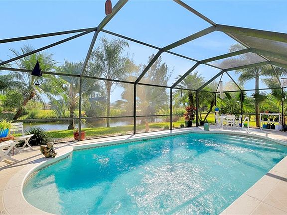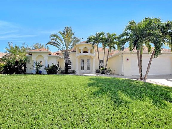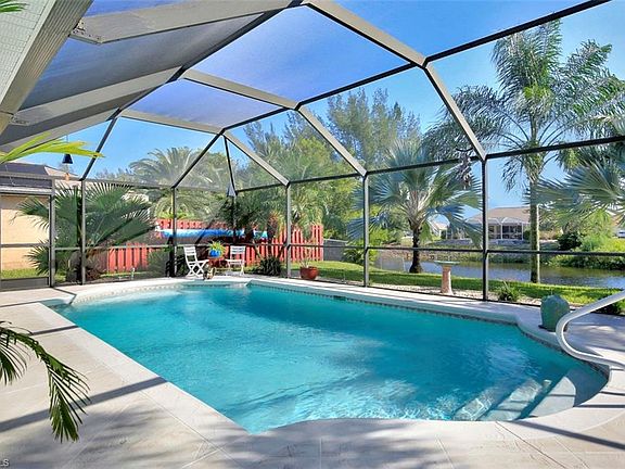 Fantastic SW Cape Coral location off Surfside. This fresh water canal, pool home impresses at every turn. Located on a beautiful street with newer luxury homes, this gorgeous home is enhanced with great landscaping. Once inside you will appreciate the 11' ceilings, 8'' doors, 17" tile throughout (except the bedrooms), upgraded kitchen with wood cabinets, granite counter tops, and Hi-end appliances. The tropical pool area features a large under truss lanai, pool bath and solar heated for your year-round enjoyment. The over-sized utility room has granite counter tops. Priced significantly below other homes on the street this is a must see!