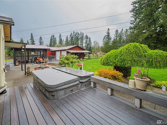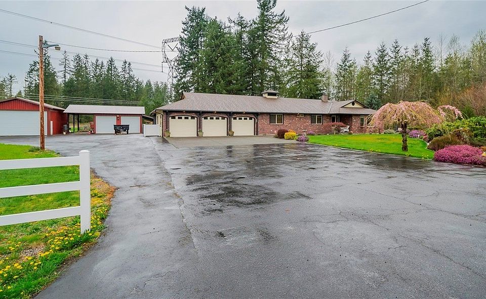 Dreams really do come true! Check out this gorgeous, private RAMBLER on 3+ flat, fenced acres + Huge SHOP/POLE BARN + 3 car attached garage AND 2 car detached garage w/carports! MORE cool property features: RV parking; generator transfer switch; covered patio; fire pit; hot tub; beautiful landscaping + separate garage office. You'll LOVE the home's spacious, open floor plan w/top quality finishes; composite granite & SS kitchen; wood stove; heat pump; central vac, & A/C. Welcome to paradise!