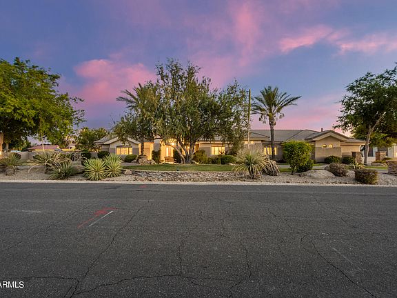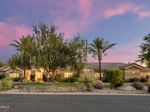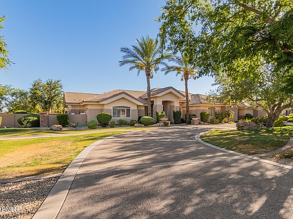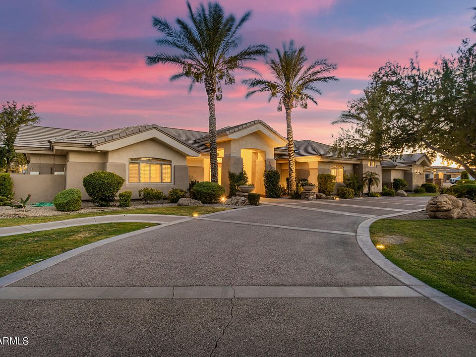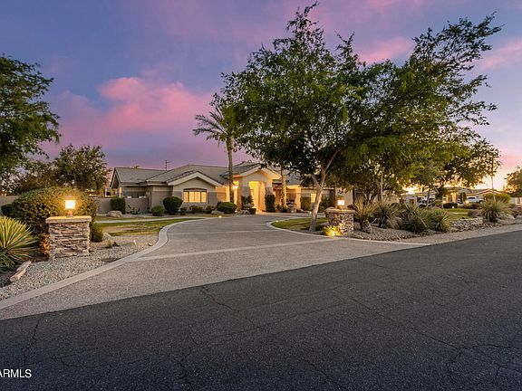 Presenting a truly spectacular corner lot property, meticulously designed & impeccably maintained! 1 Level, 1 + Acre, No HOA! Owned 30KW Solar Panel System! You'll be greeted by a grand circular driveway & great curb appeal. Captivating interior boasts elegant living ares brimming w/ natural light, soothing palette, 10ft & 12 ft ceilings, neutral tile flooring, dazzling light fixtures & a stone accented fireplace. You'll also find a fabulous custom wet bar, complete w/ bar seating, cabinetry, a wine fridge, ice maker & double beer tap Kegerator allowing easy entertaining & chic cocktail evenings! The gorgeous chef's kitchen is outfitted w/ granite counters, wood cabinetry, double wall oven, tile backsplash, a walk-in pantry, & an island w/ a breakfast bar. Open concept floor plan w/ all en-suite bedrooms. Main suite provides the perfect escape, featuring a cozy fireplace, separate sitting area, a luxurious en suite w/ spa like features, double vanities, jetted tub, separate walk in rain shower w/ body jets, oversized walk in closet & its own patio access. Private office/ 4th bedroom has a separate front entry. The resort like backyard is your own private oasis & truly an entertainer's dream! Beautifully landscaped & meticulously maintained, featuring a heated, salt water pool/spa w/ beach entry, 8 waterfalls, custom water slide & grotto. Impressive ramada complete w/ a built in fireplace, a misting system, tv's & is wired for surround sound; Outdoor kitchen/BBQ area; Fenced children's play area complete w/ artificial turf & custom built jungle gym; Block wall fencing w/ 2 RV gates, + 2 single gates & extended 3 car garage. Acre lot supports RV & boat parking plus room for other toys. Private well, city water connected (not used), & septic system.