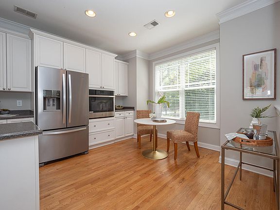 Welcome to your new abode! This charming Daniel Island townhome features freshly painted interior and oak hardwood flooring. The inviting eat-in-kitchen boasts natural light, stainless steel appliances, and ample cabinets. Ideal for hosting, the open kitchen flows seamlessly into the family room/dining combo. Upstairs, two spacious bedrooms with walk-in closets and private bathrooms offer comfort and convenience. The second floor also houses a washer and dryer. Step outside to a large composite deck and fenced private backyard which leads to a detached oversized one-car garage. Enjoy proximity to schools, Freedom Park, Smythe Park, community swimming pool and beautiful nature trails! Added bonus of a new oven and microwave. HVAC system replaced 2018. Your perfect home awaits!