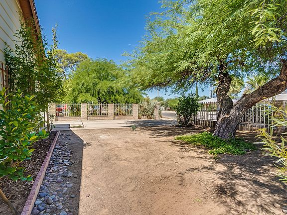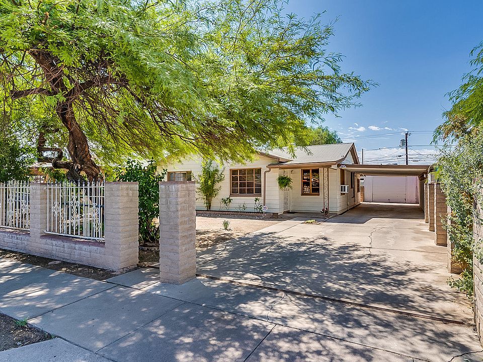 Great investor or starter home in established central neighborhood conveniently located near Reid Park, shopping, restaurants, UofA and downtown. Two bedroom one full bathroom with a bonus room, den or work room beyond kitchen. Detached garage and tandem carport provides covered parking for 3 cars. Hard floors throughout the house. Nice yard with mature trees, front yard features masonary and wrought iron fencing with sliding gate to enclose your private yard. Alley access from rear yard as well. House has nice curb appeal. Bring your ideas and imagination to make it yours. Needs some updating but home has great potential.