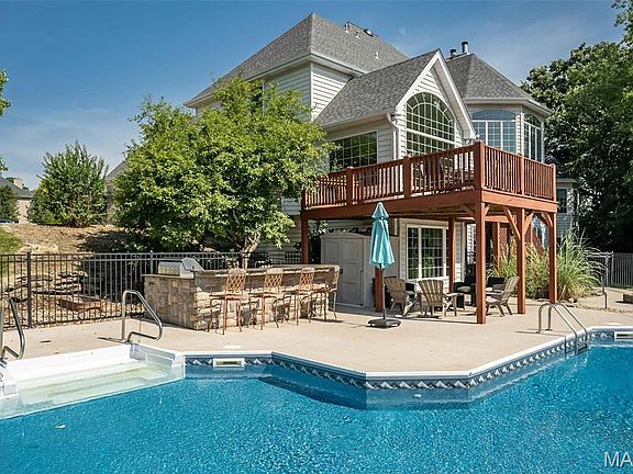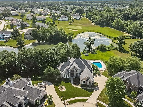 Live every day like you're on vacation in this stunning 1.5-story retreat, perfectly perched on a cul-de-sac lot backing to Bear Creek Golf Course and the lake. The dreamy backyard was made for entertaining with an outdoor kitchen, fire pit, inground pool, and a view that’ll have your jaw on the floor. Inside, the two-story Great Room steals the spotlight with soaring Palladian windows stretching up three stories, offering panoramic views of the water and fairway. The main floor primary suite is a true escape with its gas fireplace, tray ceiling, and private sitting area. The kitchen checks every box—granite countertops, center island, Jenn-Air cooktop, and loads of cabinetry—and is flanked by a sunny breakfast room, cozy hearth-style sunroom, and formal dining and den spaces. Upstairs you’ll find three additional bedrooms, two full baths, and a loft, while the finished walkout lower level brings the party with a second full kitchen, media room, 5th bedroom, and another full bath. Updated roof, windows, HVAC, interior paint, pool liner, and more mean all the heavy lifting is done. This home is a rare blend of luxury, comfort, and unmatched views—don’t miss your chance to claim this one-of-a-kind gem! Ideal for the growing or multigenerational family.